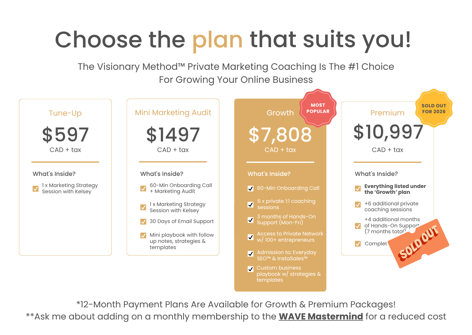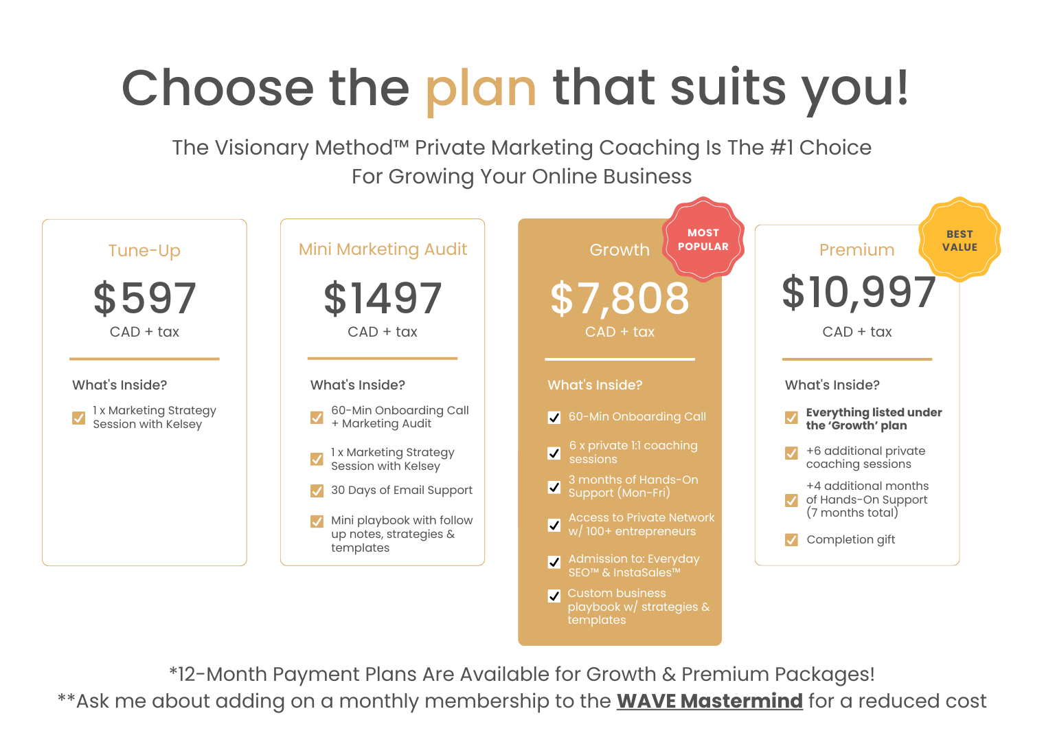 Please see the comparison chart on this page for our up to date pricing on all packages for Business and Marketing Coaching!